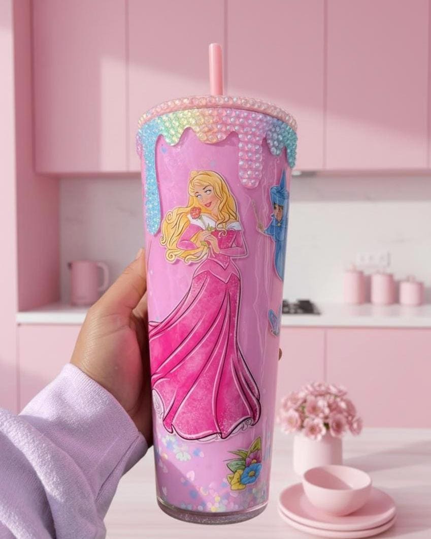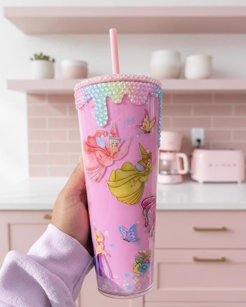This 20oz coquette princess inspired tumbler is made for the soft girl era. Featuring a glossy pink finish and a handmade rhinestone drip lid, this cup gives full fairytale aesthetic vibes.